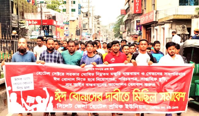 ঈদ বোনাস দাবিতে জেলা হোটেল শ্রমিক ইউনিয়নের বিক্ষোভ