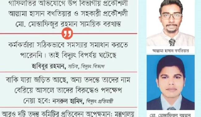 আজকের সিলেট ডেস্ক : জাতীয় গ্রিড বিপর্যয়ের নেপথ্য কারণ হিসেবে পাওয়ার গ্রিড কোম্পানি অব বাংলাদেশ (পিজিসিবির) দুই কর্মকর্তার গাফিলতির প্রমাণ পেয়েছে বিদ্যুৎ বিভাগ কর্তৃক গঠিত তদন্ত কমিটি। তারা হলেন- পিজিসিবির উপসহকারী প্রকৌশলী আল্লামা হাসান বখতিয়ার ও সহকারী প্রকৌশলী মোস্তাফিজুর রহমান।