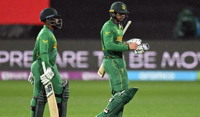 ৮০ রানের লক্ষ্য পেরোতে ব্যাট করতে নেমে কুইন্টন ডি কক প্রথম ওভারেই নেন ২৩ রান। দ্বিতীয় ওভারে তা নিয়ে যান ৩৯ রানে। তৃতীয় ওভারে রানের খাতা খুলেন অপরপ্রান্তে থাকা বাভুমা। তার ২ রান ও ককের ১৮ বলে ৪৭-এ ৫১ রান সংগ্রহ করে দক্ষিণ আফ্রিকা। এরপর পরিত্যক্ত হয় ম্যাচ। ককের অপরাজিত ইনিংসটি সাজানো ছিল ৮ চার ও ১ ছক্কায়।