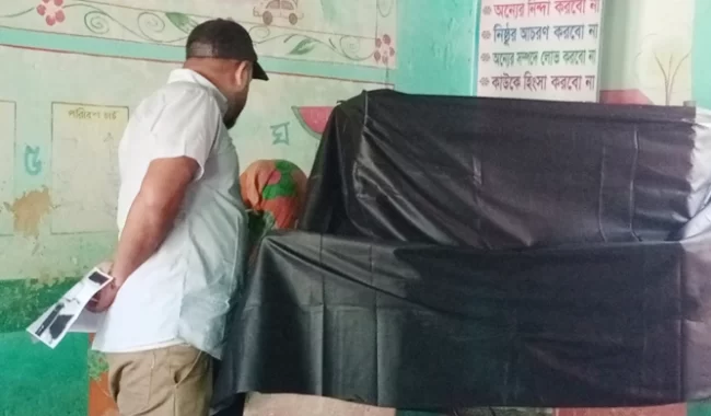 সকাল ১০টার দিকে ওই কেন্দ্রে গিয়ে দেখা যায়, ভোটারের সঙ্গে গোপন কক্ষে ঢুকে পড়েন পোলিং কর্মকর্তা লুৎফুর রহমান। এ সময় তিনি নিজে হাত দিয়ে ভোট দিচ্ছিলেন। গোপন কক্ষে ঢোকার বিষয়ে জানতে চাইলে তিনি কোনো কথা বলেননি।