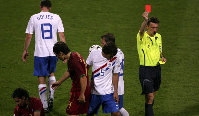৩. ২০০৬ বিশ্বকাপে ব্যাটেল অব নুরেমবার্গ (পর্তুগাল-নেদারল্যান্ডস)- বিশ্বকাপ ফুটবলের সবচেয়ে কলঙ্কিত ম্যাচের একটি ছিল ২০০৬ এ জার্মানিতে অনুষ্ঠিত বিশ্বকাপে নেদারল্যান্ডস ও পর্তুগালের মধ্যকার ম্যাচটি। রাউন্ড অফ সিক্সটিন-এ দু’দল মুখোমুখি হয়। ২৫ শে জুন ম্যাচটির দায়িত্বে ছিলেন রাশিয়ান রেফারি ভ্যালেন্টিন ইভানোভ। ম্যাচ শেষ হবার আগ পর্যন্ত রেফারিকে দুই দলের খেলোয়াড়দের মোট ১৬টি হলুদ কার্ড এবং ৪ বার লাল কার্ড দেখাতে হয়। নেদারল্যান্ডস এবং পর্তুগাল দু’দলেরই ফেয়ার প্লে’র জন্য সুনাম রয়েছে, কিন্তু বিশ্বকাপ ফুটবলের সবচেয়ে কলঙ্কিত ম্যাচের কালিমা এই দুই দেশই বহন করে চলছে। খেলা শেষে অবশ্য কেউ কেউ ম্যাচটাকে রাগবি ম্যাচের সঙ্গে তুলনা করেছেন। ফিফার সেসময়ের প্রেসিডেন্ট সেপ ব্লাটার ম্যাচটি সম্পর্কে বলেন, ম্যাচে দুর্বল পারফরমেন্সের জন্য রাশিয়ান রেফারি ভ্যালেন্টিন’র উচিত ছিল নিজেকে নিজেই হলুদ কার্ড দেখানো।