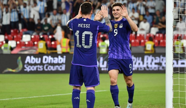 স্টেডিয়ামে আর্জেন্টিনা দল প্রবেশ করতেই সবার চোখ মেসির ওপর। বলে তার প্রতি স্পর্শে দর্শকরা উল্লাসে যেন ফেটে পড়েন। নিজেদের দেশেই যেন সফর করেছে আরব আমিরাত। প্রতিপক্ষ আর্জেন্টিনাকেই মনে হচ্ছিল স্বাগতিক দল। এমন ম্যাচে বল পায়ে জ্বলে উঠেছেন লিওনেল স্কালোনির শিষ্যরাও। আন্তর্জাতিক প্রীতি ম্যাচে বুধবার রাতে আরব আমিরাতকে ৫-০ ব্যবধানে হারিয়ে বিশ্বকাপে প্রস্তুতি সারলেন তারা।
