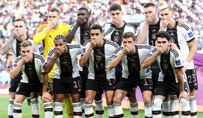 ২০২২ কাতার বিশ্বকাপের গ্রুপ পর্বে নিজেদের প্রথম ম্যাচে আজ আল রাইয়ানের খলিফা ইন্টারন্যাশনাল স্টেডিয়ামে জাপানের মুখোমুখি হয়েছে জার্মানরা। ম্যাচের আগে গ্রুপ ফটো তোলার সময় হাত দিয়ে মুখ চেপে ধরে দাঁড়ান ম্যুলার-কিমিচরা। নিষেধাজ্ঞার ভয়ে যে মুখ খুলতে পারছেন না; তা এভাবেই বুঝিয়ে দিলেন তারা। সেই সঙ্গে নীরব প্রতিবাদও হয়ে গেল।