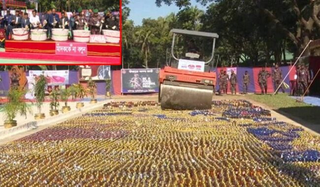 ধ্বংসকৃত মাদকদ্রব্যের মধ্যে ছিল ৬৫ হাজার ৬০১ বোতল ভারতীয় বিভিন্ন ব্র্যান্ডের মদ, নয় হাজার ৫৬৭ বোতল ফেনসিডিল, পাঁচ হাজার ৮৬ পিস ইয়াবা, বাংলা মদ (লুজ) ১৯৭ লিটার, ভারতীয় তামাক পাতা ২৪৭ কেজি, গাঁজা ১৪ হাজার ৬৮২ কেজি, বিয়ারের ক্যান দুই হাজার ২৩৭টি, ভারতীয় পাতার বিড়ি চার কোটি ৪৩ লাখ ৩৪ হাজার ৮৫০ পিস, সিগারেট ১১ লাখ ৩০ হাজার ২০০ পিস।