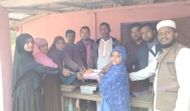 রোববার (১ জানুয়ারি) সকালে মাদ্রাসা প্রাঙ্গণে শিক্ষার্থীদের হাতে নতুন বই তুলে দেন মাদ্রাসা পরিচালনা কমিটির সভাপতি ও স্হানীয় ওয়ার্ড মেম্বার ফারুক আহমদ ও শিক্ষকমন্ডলীগন।