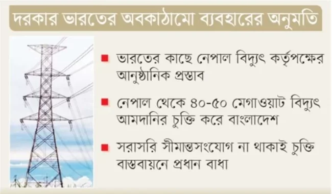তবে ভারতের অনুমতি পেতে নেপালের পক্ষ থেকে চেষ্টা চালিয়ে যাওয়া হচ্ছে। কুল মান ঘিসিং আরও বলেন, ‘আমরা ভারতীয় পক্ষের কাছে দ্বিতীয়বার অনুরোধ জানিয়েছি। তারা আবারও নিজেদের ট্রান্সমিশন সক্ষমতা পুনর্মূল্যায়ন করে আমাদের প্রতিক্রিয়া জানাবে।’