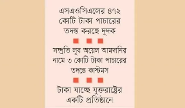 এরই মধ্যে সম্প্রতি নতুন করে যুক্তরাষ্ট্রের একটি প্রতিষ্ঠানে তিন কোটি টাকার বেশি পাচারের অভিযোগ উঠেছে এসএওসিএলের বিরুদ্ধে। এ অর্থ পাচার করা হয়েছে লুব অয়েল আমদানির নামে। যা তদন্তে নেমেছে চট্টগ্রাম কাস্টমস হাউজ।