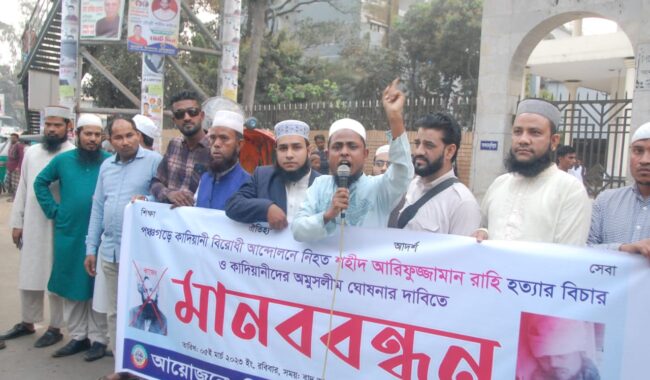 ডেস্ক রিপোর্ট : পঞ্চগড়ে কাদিয়ানী বিরোধী আন্দোলনে নিহত শহীদ আরিফুজ্জামান রাহি হত্যার বিচার ও কাদিয়ানীদের অমুসলিম ঘোষণার দাবিতে মানববন্ধন অনুষ্ঠিত হয়েছে। রোববার বাদ আছর সিলেট কোর্ট পয়েন্টে সিলেট ফাউন্ডেশন বাংলাদেশ এর উদ্যোগে এক মানববন্ধনের আয়োজন করা হয়।