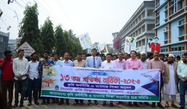 ডেস্ক রিপোর্ট : নানা আয়োজনে সিলেট কৃষি বিশ্ববিদ্যালয়ের কৃষি অর্থনীতি ও ব্যবসায় শিক্ষা অনুষদের ১৩তম প্রতিষ্ঠাবার্ষিকী উদযাপিত হয়েছে। ৬মার্চ সোমবার ছাত্র-ছাত্রী, শিক্ষক-কর্মকর্তা ও কর্মচারীদের অংশগ্রহণে আয়োজন করা হয়। জনসংযোগ ও প্রকাশনা দপ্তর জানায়, দুপুর ১টা ৩০ মিনিটে কৃষি অর্থনীতি ও ব্যবসায় শিক্ষা অনুষদীয় ছাত্রসমিতির উদ্যোগে এই আনন্দ র্যালিটি অনুষ্ঠিত হয়। র্যালির নেতৃত্ব দেন ভাইস-চ্যান্সেলর প্রফেসর ডাঃ মোঃ জামাল উদ্দিন ভূঞা। পরে দুপুর ১টা ৪৫ মিনিটে ঐকতান নামে একটি দেয়ালিকার উন্মোচন করেন। দুপুর ২টায় প্রতিষ্ঠাবার্ষিকীর কেক কাটা হয় এবং একটি আলোচনা অনুষ্ঠানের আয়োজন করা হয়।