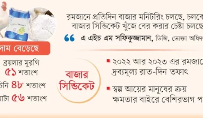 জাতীয় ভোক্তা অধিকার সংরক্ষণ অধিদপ্তরের মহাপরিচালক এ এইচ এম সফিকুজ্জামান বলেন, আমাদের কার্যক্রম চলমান। রমজানে প্রতিদিন বাজার মনিটরিং চলছে, চলবে। ভোক্তাদের জন্য আমাদের যতটুকু করতে হয় আমরা করবো। বাজার সিন্ডিকেট একে একে খুঁজে বের করার চেষ্টা চলছে।