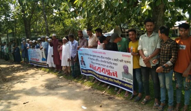 সোমবার (৮ মে) বিকাল ৩ টায় উপজেলার বাংলাবাজার ইউনিয়নের ইসলামপুর ছিদ্দিকিয়া দাখিল মাদসার সংলগ্ন রাস্তায় মাদরাসার প্রাক্তন ছাত্র পরিষদ,বর্তমান ছাত্রছাত্রী ও এলাকাবাসীর আয়োজনে সমাজ সেবক আব্দুল মান্নান ফরিরের সভাপতিত্বে মাওলানা আবুল হোসাইনের পরিচালনায় অনুষ্ঠিত মানববন্ধনে বক্তব্য রাখেন মাদরাসার প্রাক্তন ছাত্র পরিষদের আহবায়ক পীর মাওলানা গোলামুর রহমান জিলানী,স্থানীয় ইউপি সদস্য আব্দুল কাদির,সমাজ সেবক আব্দুল হান্নান, মুক্তার হোসেন,মনির হোসেন, আব্দুল ওহাব,সূরুজ মিয়া,আসমত আলী, আব্দুল বারেক,মুক্তার হোসেন প্রমুখ।