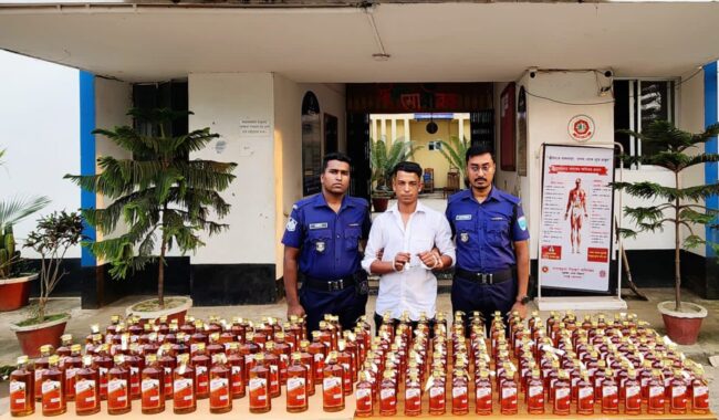 শুক্রবার বিকাল সাড়ে ৩টায় কানাইঘাট থানাধীন ০৩ নং দিঘীরপাড় পূর্ব ইউনিয়নের অর্ন্তগত দর্পনগর পূর্ব সাকিনস্থ আলতাফ চেয়ারম্যনের বাড়ীর সংলগ্ন মরহুম মনাই মিয়া শাহ মাজারের পাশে’র রাস্তার উপর গোপন সংবাদের ভিত্তিতে অভিযান পরিচালনা করে পুলিশ। অভিযানে একটি সিএনজি’তে থাকা ৩টি বস্তায় মোট ১৯২ বোতল ভারতীয় আমদানী নিষিদ্ধ অফিসার্স চয়েস মদ’সহ কুখ্যাত মাদক ব্যবসায়ী করিম উদ্দিন (২৪) কে আটক করে পুলিশ।