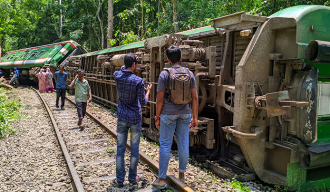 শনিবার ভোর ৪টা ৪৫ মিনিটের দিকে মৌলভীবাজারের কমলগঞ্জের লাউয়াছড়া জাতীয় উদ্যান সীমানায় এভাবেই দুর্ঘটনার কবলে পড়ে ট্রেনটি।