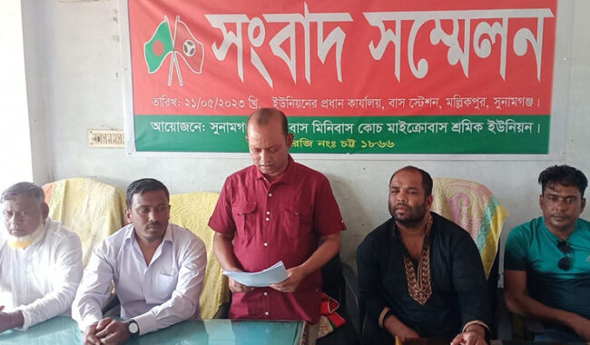 রোববার দুপুরে সুনামগঞ্জ নতুন বাসস্ট্যান্ডে সংবাদ সম্মেলনে ধর্মঘটের ঘোষণা দেয় পরিবহন শ্রমিক ইউনিয়ন।