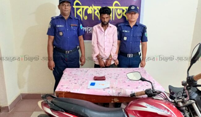 মধ্যনগর (সুনামগঞ্জ) প্রতিনিধি : সুনামগঞ্জের মধ্যনগরে আটারো পিস ইয়াবা ট্যাবলেট ও ১টি মোটরসাইকেল’সহ এক মাদক কারবারি’কে আটক করেছে মধ্যনগর থানা পুলিশ। শনিবার বিকেলে মধ্যনগর উপজেলার সদর ইউপির ৪নং ওয়ার্ডে তেলিপাড়ার কবরস্থান সংলগ্নএলাকা থেকে তাকে আটক করা হয়।