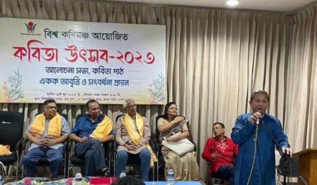 নিজেস্ব প্রতিবেদক : গতকাল ১১ জুন ২০২৩ বিশ্বসাহিত্য কেন্দ্রে ঢাকায় বিশ্ব কবিমঞ্চ এর কবিতা উৎসব ২০২৩ অনুষ্ঠিত হয়। অধ্যাপক নিরঞ্জন অধিকারী সভাপতিত্বে অনুষ্ঠান উদ্বোধন করেন অধ্যাপক ডা. কবি হারিসুল হক, প্রধান অতিথি ছি লেন বাংলাদেশ শিশু একাডেমির মহাপরিচালক কবি আনজীর লিটন,বিশেষ অতিথি অধ্যাপক ডা. মামুন আল মাহতাব স্বপ্নীল, বিশ্ব কবিমঞ্চ কেন্দ্রীয় আহবায়ক পুলক কান্তি ধর,প্রধান আলোচক কবি ড. সৈয়দ আজিজ,সংবর্ধিত অতিথি ভারতের পশ্চিমবঙ্গে বিশিষ্ট বাচিক শিল্পী স্বপ্না দে।