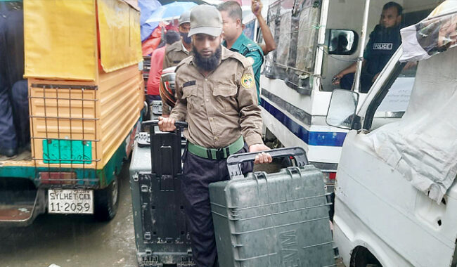 মঙ্গলবার সকাল ১১টা থেকে নগরের মেন্দিবাগের আবুল মাল আব্দুল মুহিত ক্রীড়া কমপ্লেক্সে রিটার্নিং কর্মকর্তা ও সিলেটের আঞ্চলিক নির্বাচন কর্মকর্তা ফয়সাল কাদেরের কাছ থেকে সংশ্লিষ্ট কেন্দ্রের প্রিসাইডিং অফিসাররা ইভিএম মেশিনসহ নির্বাচনের আনুষঙ্গিক সরঞ্জামাদি গ্রহণ করেন। পরে তারা নিরাপত্তাকর্মীদের সঙ্গে নিয়ে ভোটকেন্দ্রে নিয়ে যাচ্ছেন।