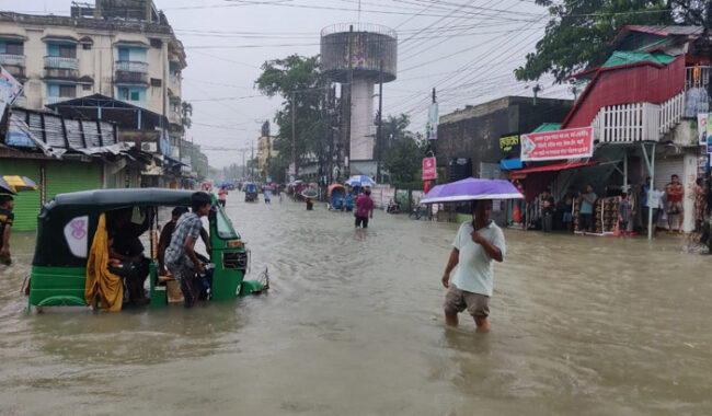 নিজস্ব প্রতিবেদক : কয়েক দিন ধরে টানা বর্ষণ ও পাহাড়ি ঢলে সিলেটে বন্যা পরিস্থিতির অবনতি ঘটেছে। সিলেট বিভাগের উপর দিয়ে বয়ে যাওয়া সুরমা-কুশিয়ারাসহ সকল নদনদীর পানি বিপদসীমার উপর দিয়ে প্রবাহিত হচ্ছে। এতে সিলেট জেলার অধিকাংশ উপজেলা ও সুনামগঞ্জশহরসহ জেলার সবকটি উপজেলায় বন্যারি পনিতে তলিয়ে গেছে। লোকালয় ও রাস্তাঘাট ডুবে যাওয়ায় পানিবন্দি হয়ে পড়েছেন লাখ লাখ মানুষ।
