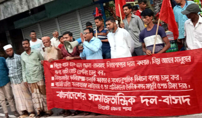 ডেস্ক রিপোর্ট : বিদ্যুত-গ্যাস-চাল-ডাল-তেল-তরকারিসহ নিত্যপণ্যের দাম কমানো, সুষ্ঠু নির্বাচনের জন্য নির্বাচনকালীন দলনিরেপক্ষ তদারকি সরকার গঠনের দাবিতে বাংলাদেশের সমাজতান্ত্রিক দল -বাসদ সিলেট জেলা শাখার উদ্যোগে বিক্ষোভ সমাবেশ অনুষ্ঠিত হয়েছে।