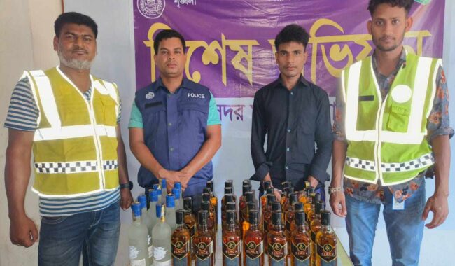 পুলিশ সূত্রে জানাযায়, গোপন সংবাদের ভিত্তিতে সদর থানার অফিসার ইনর্চাজ এর নির্দেশনায় এস আই শরিফ ও এ এস আই খায়রুল এর নেতৃত্বে সঙ্গীয় ফোর্স নিয়ে বিশেষ অভিযান চালিয়ে মঙ্গলবার বিকালে বর্ডার থেকে নিয়ে আসার সময় ৯বোতল ম্যাজিক মোমেন্ট ও এসি ব্ল্যাক ৩১ বোতল ভারতীয় মদসহ রাধানগর পয়েন্ট থেকে বিশ্বম্ভরপুর উপজেলার ধনপুর ইউনিয়নের পশ্চিম রাজনগর গ্রামের আবু বক্কর মিয়ার পুত্র মো: সুজন মিয়াকে আটক করা হয়েছে।