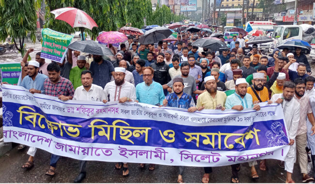 রোববার দুুপরে জামায়াতের কেন্দ্রীয় বিক্ষোভ কর্মসূচীর অংশ হিসেবে, ঢাকাসহ সারাদেশে জামায়াতের কর্মসূচী পালনের অনুমতি না দেয়ার প্রতিবাদে নগরীতে বিক্ষোভ মিছিল ও সমাবেশ করেছে সিলেট মহানগর জামায়াত। সিলেট মহানগর