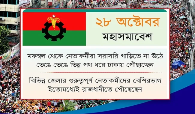 আগামী ২৮ অক্টোবর সমাবেশের মধ্য দিয়ে দলগুলো রাজপথে নিজেদের শক্তির জানান দিতে চায়। সব দলই সেদিন সর্বোচ্চ সংখ্যক নেতাকর্মীর উপস্থিতি নিশ্চিত করতে দফায় দফায় বৈঠক করছে। নেতাকর্মীদের দিচ্ছে নানা নির্দেশনা। এ কর্মসূচি নিয়ে টানটান উত্তেজনা বিরাজ করছে, জনমনেও দেখা দিয়েছে নানা শঙ্কা।