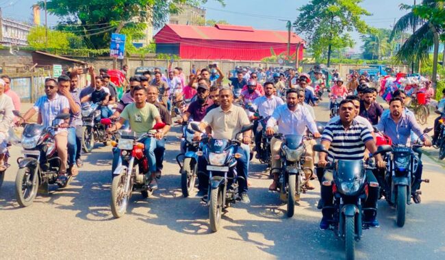 সিলেটের দক্ষিণ সুরমায় বিএনপি জামায়াতের হরতালের প্রতিবাদে এমপি হাবিবের নেতৃত্বে রবিবার সকালে দক্ষিণ সুরমা উপজেলা আওয়ামীলীগ ও অঙ্গ সহযোগী সংগঠনের নেতৃবিন্দকে নিয়ে দক্ষিণ সুরমার চন্ডিপল থেকে রেজিস্ট্রারি মাঠ পর্যন্ত এক বিশাল মোটরসাইকেল শোডাউন দেওয়া হয়েছে।