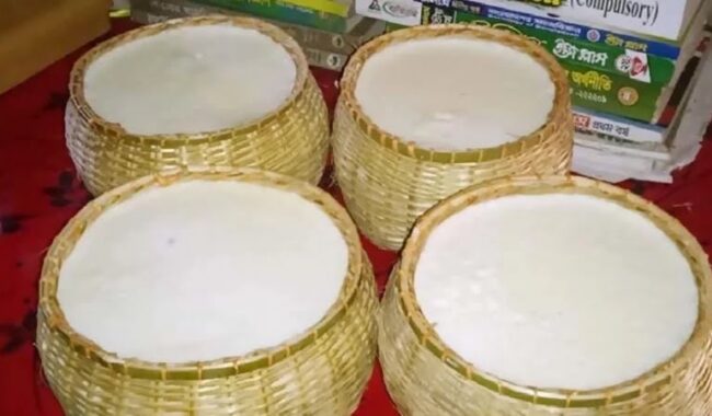 বড়লেখা ( মৌলভীবাজার ) প্রতিনিধি : মাটির হাঁড়ির পাশাপাশি ঝুড়িতে (ধুছনি) দই পাতেন গৌরাঙ্গ দাসের (৫৪) পরিবার। দুইযুগেরও বেশি সময় ধরে এই কাজ করেই উপার্জন করেন তারা। স্থানীয়ভাবে বিয়েসহ বিভিন্ন অনুষ্ঠানে হাঁড়ির দইয়ের পাশাপাশি এগুলো কেনেন অনেকে। ভিন্ন স্বাদের এই ধুছনি দইয়ের আঁতুড়ঘর মৌলভীবাজারের বড়লেখা উপজেলার বর্নি ইউনিয়নের মিহারী গ্রামে। এটি তৈরি করা হয় গরু ও মহিষের দুধে। গোলগাল পাত্রটিও ভিন্ন ধাঁচের, বাঁশের তৈরি ঝুড়ি, যা ‘ধুছনি’ নামে পরিচিত।