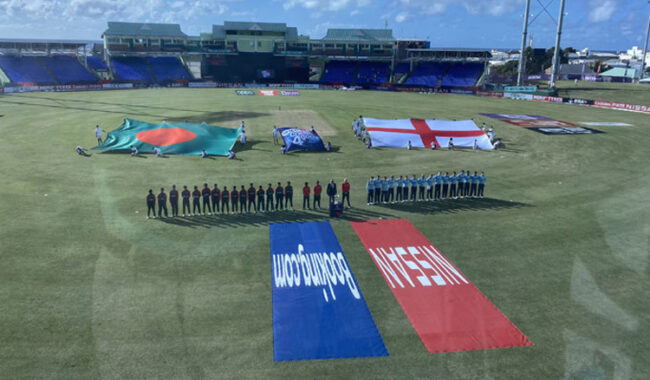 রোববার ওয়েস্ট ইন্ডিজের সেন্ট কিটসের বাসেটে টস জিতে প্রথমে ব্যাট করার সিদ্ধান্ত নেন অধিনায়ক রাকিবুল হাসান।