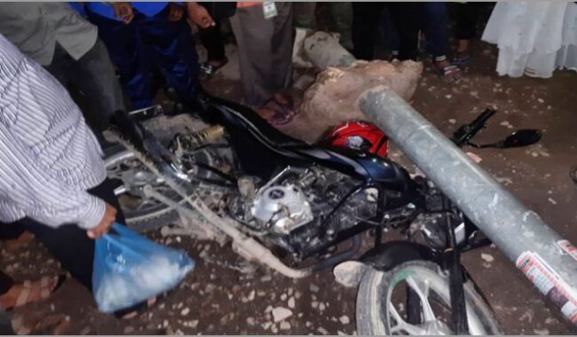 প্রত্যক্ষদর্শীরা জানান, নতুন পোঁতা ওই খুঁটির সঙ্গে জিন্দাবাজারের দিকে টানা বৈদ্যুতিক লাইন সংযুক্ত ছিল। ওই লাইনে একটি ট্রাকের ওপরের অংশ লেগে খুঁটিতে টান পড়লে তা মোটরসাইকেল আরোহীর ওপর পড়ে যায়।