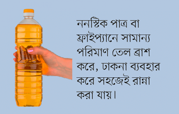 লাইফস্টাইল ডেস্ক : আমাদের গতানুগতিক রান্নার ধরনে প্রচুর তেল, মসলা ব্যবহার করা হয়। অথচ একটু সচেতন হলে তেলের ব্যবহার অনেকটাই কমিয়ে আনা যায়। প্রতিদিনের ক্যালরি চাহিদার শতকরা ২৫-৩০ শতাংশ তেল ও চর্বিজাতীয় খাদ্য থেকে গ্রহণের কথা। এই পরিমাণের পুরোটাই যে ভোজ্যতেল থেকে হতে হবে, তা কিন্তু নয়।