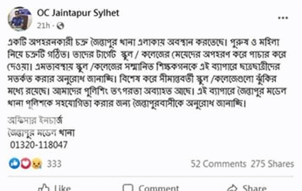 তাতে লেখা হয়েছে, ‘একটি অপহরণকারী চক্র জৈন্তাপুর থানা এলাকায় অবস্থান করতেছে। পুরুষ ও মহিলা নিয়ে চক্রটি গঠিত। তাদের টার্গেট স্কুল / কলেজের মেয়েদের অপহরণ করে পাচার করে দেওয়া। এমতাবস্থায় স্কুল /কলেজের সম্মানিত শিক্ষকগণকে এই ব্যাপারে ছাত্রছাত্রীদের সতর্ক করার অনুরোধ জানাচ্ছি। বিশেষ করে সীমান্তবর্তী স্কুল /কলেজগুলো ঝুঁকির মধ্যে রয়েছে। আমাদের পুলিশিং তৎপরতা অব্যাহত আছে। এই ব্যাপারে জৈন্তাপুর মডেল থানা পুলিশকে সহযোগিতা করার জন্য জৈন্তাপুরবাসীকে অনুরোধ জানাচ্ছি।’
