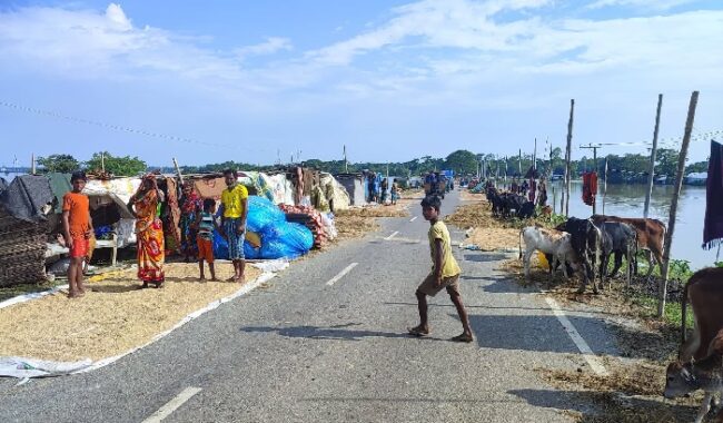 মবশ্বিরের মতো কয়েক শ পরিবার আশ্রয় নিয়েছে সড়কের পাশে। তাদের সবার ঘরেই বন্যার পানি। কারও ঘর ভেঙেও গেছে পানিতে।